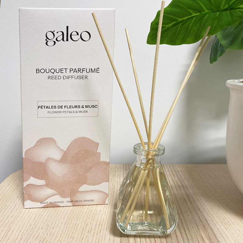 Create a romantic and gentle atmosphere in your home with our Flower Petals and Musk reed diffuser. Made in France in our workshops, this home diffuser blends the delicate freshness of flower petals with the warm, enveloping depth of musk. Its elegant, refillable glass bottle, accompanied by natural rattan sticks, ensures a gentle diffusion and a refined decorative touch for any room.