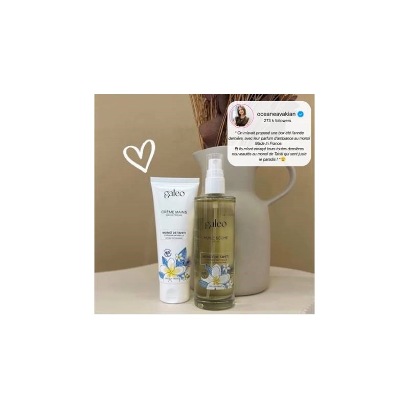 This dry oil contains 100% natural origin Monoï de Tahiti oil, known for its nourishing and softening properties, along with refined sweet almond oil and refined sunflower oil. This sublimating oil leaves a non-greasy finish and a delicate fragrance of exotic flowers with sensual, sunny notes. A true beauty secret from Polynesia, this multi-purpose dry oil for body and hair is the perfect everyday ritual.